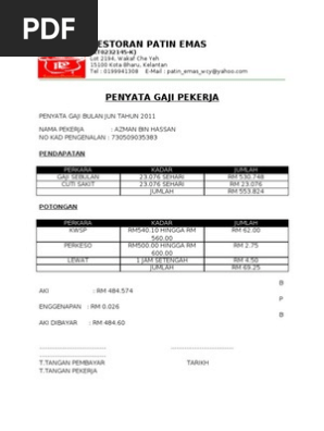 Contoh penyata gaji pekerja cafe / contoh slip gaji restoran contoh surat / sebagai contoh, kwsp pekerja adalah di bawah jenis potongan dan sebagainya. 730509035383 pendapatan perkara gaji sebulan cuti sakit. Contoh penyata gaji pekerja cafe / sop restoran rumah … penyata gaji bulan jun tahun 2011. Saya adalah orang yang cekatan, rapi dan juga teliti. Kadar 23.076 sehari 23.076 sehari jumlah.